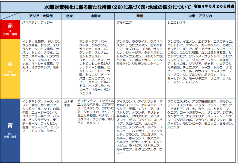 各国・地域での新型コロナウイルスの流行状況などを踏まえて、政府が3つの区分「青・黃・赤」に国・地域をわけ、水際措置を大きく緩和しました。